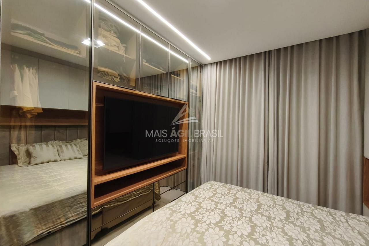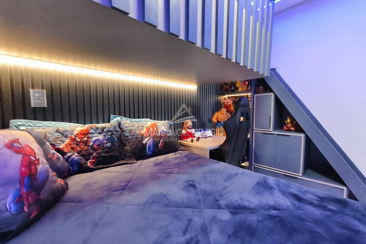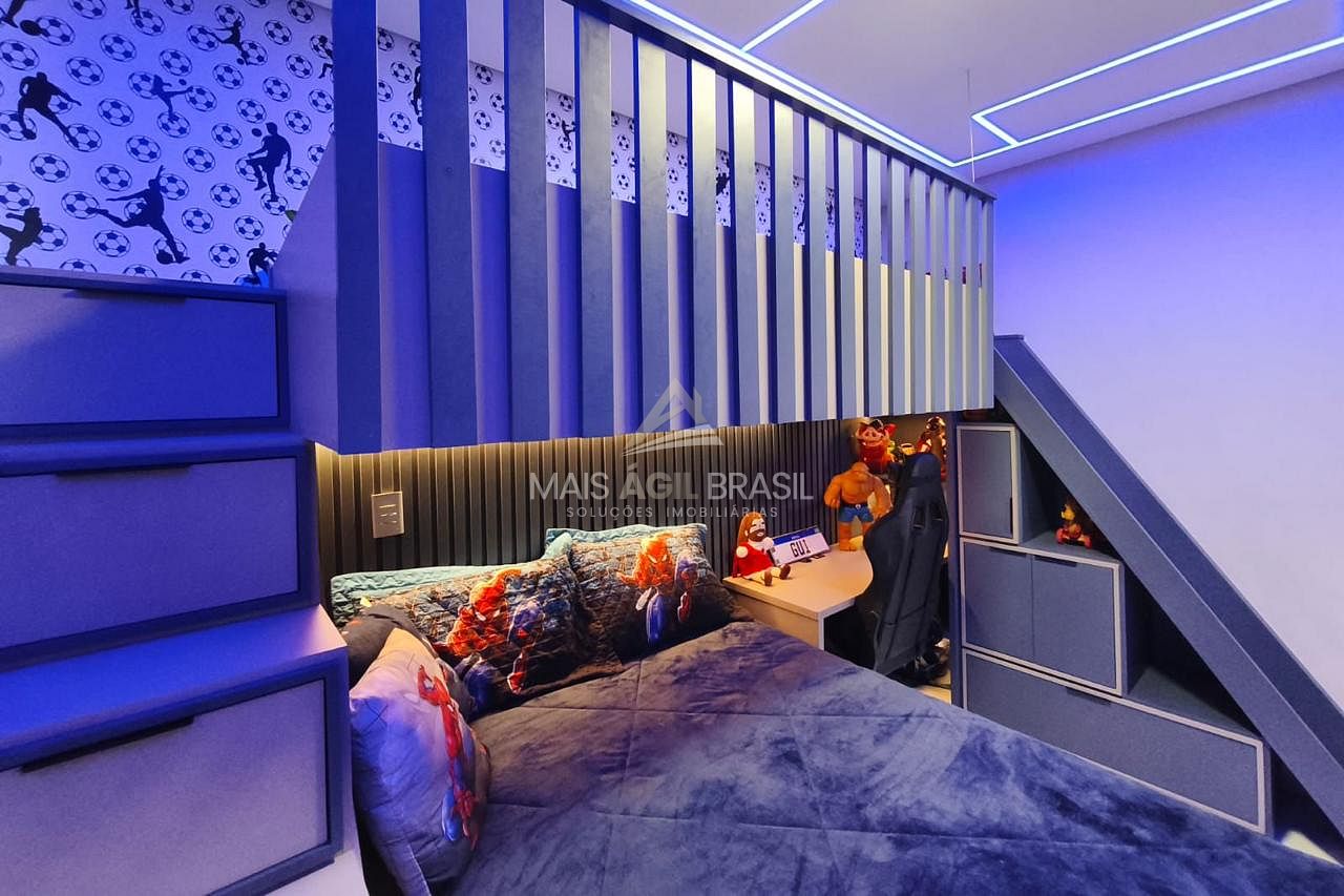 Com fácil acesso às rodovias e excelente infraestrutura ao redor, próximo a mercados, academias, Havan e Carrefour. Um imóvel completo, moderno e riquíssimo em móveis planejados, parte superior, o imóvel conta com 3 dormitórios, sendo 1 suíte com sacada, todos com armários planejados e ar condicionado, dois quartos infantis são temáticos e com teto em LED em formato de campo de futebol, criando ambientes lúdicos, modernos e cheios de personalidade: