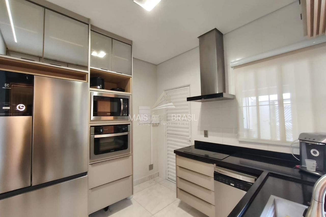 Pavimento térreo, a casa oferece sala ampla com ar condicionado e muito bem liluminada, com uma cristaleira elegante, além de um charmoso espaço de café com cristaleira exclusiva. Possui ainda lavabo! A cozinha é completa e extremamente rica em armários planejados, equipada com fogão por indução, forno embutido, coifa, pia gourmet, persiana e iluminação em LED, unindo funcionalidade e sofisticaçã.