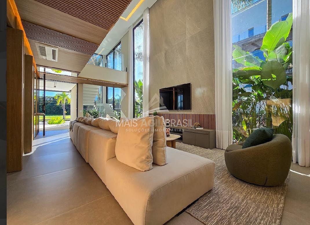 Living com pé-direito duplo, 3 ambientes, 1 suíte com varanda, lavabo, cozinha americana com madeira nobre.