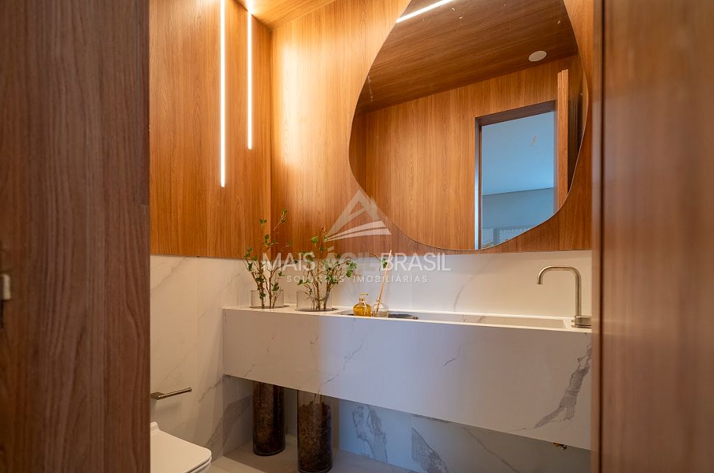 Living com pé-direito duplo, 3 ambientes, 1 suíte com varanda, lavabo, cozinha americana com madeira nobre.