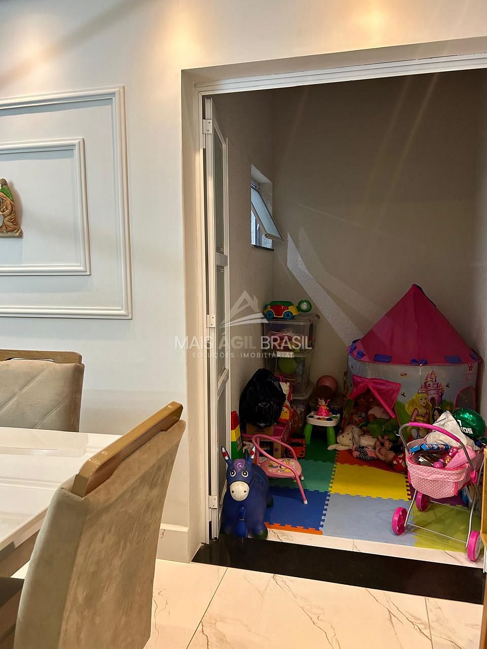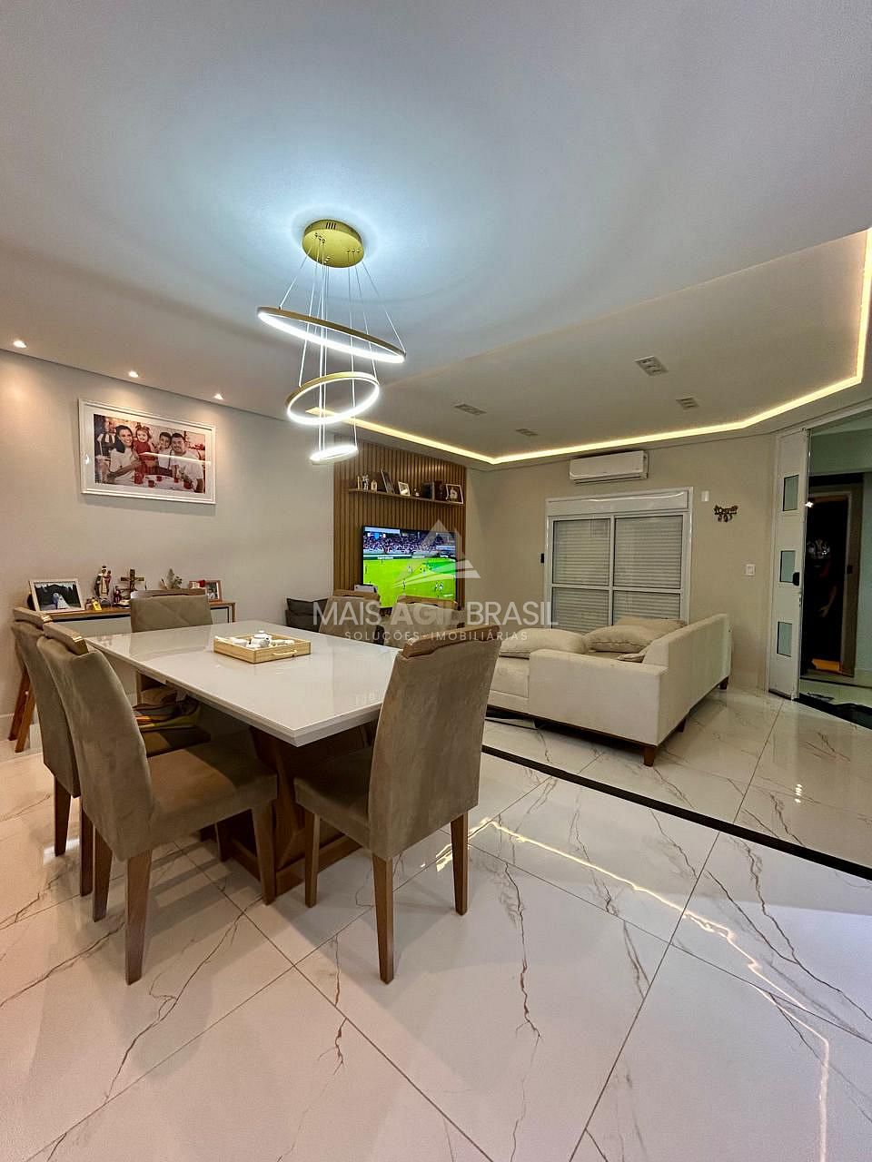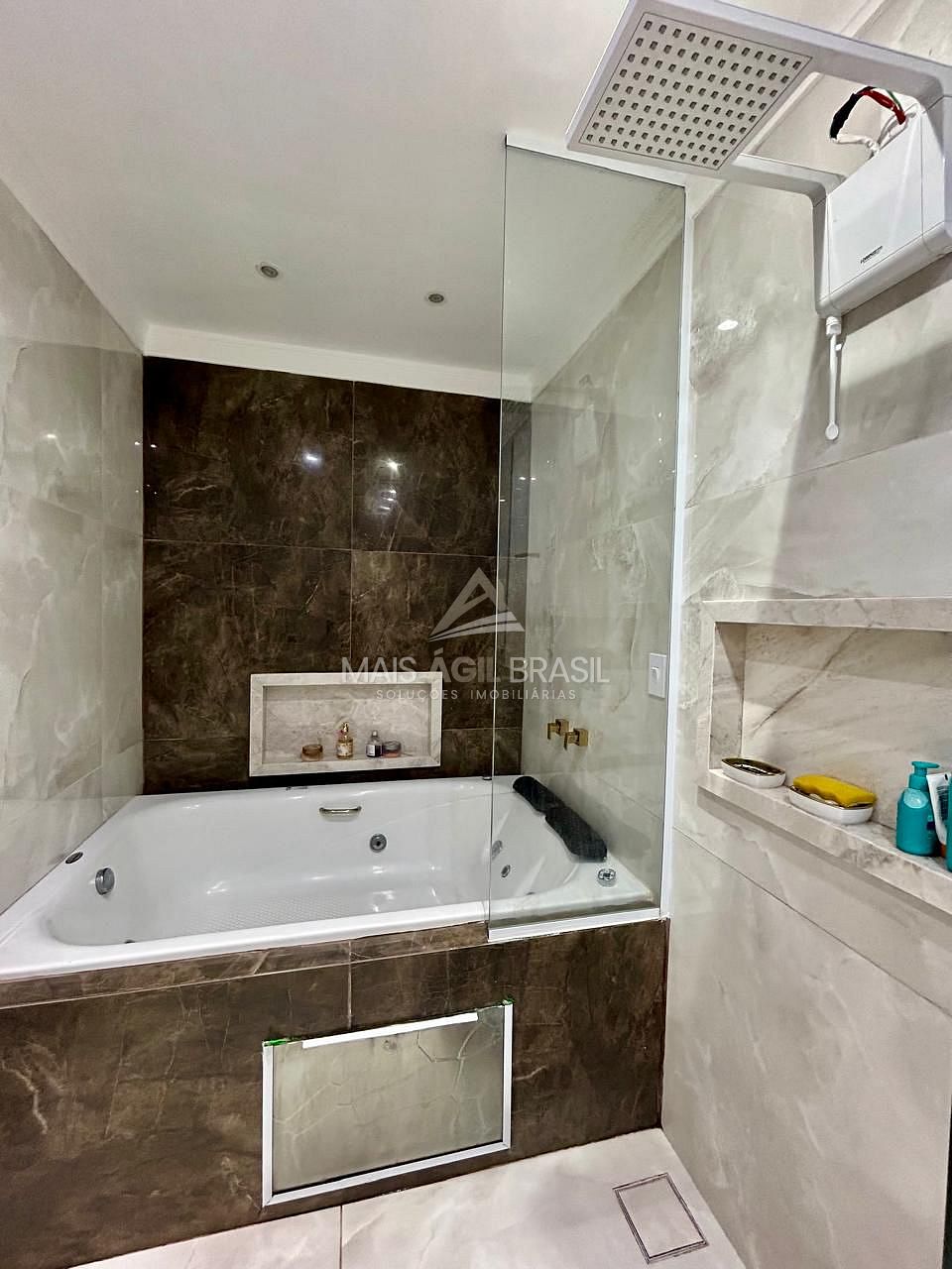 3 dormitórios sendo uma suíte com closet e hidromassagem, Ar condicionado na suíte, Ar condicionado na sala, Ventilador nos quartos, Sala 2 ambientes, Cozinha, Wc social.